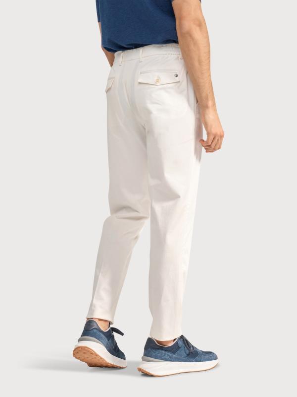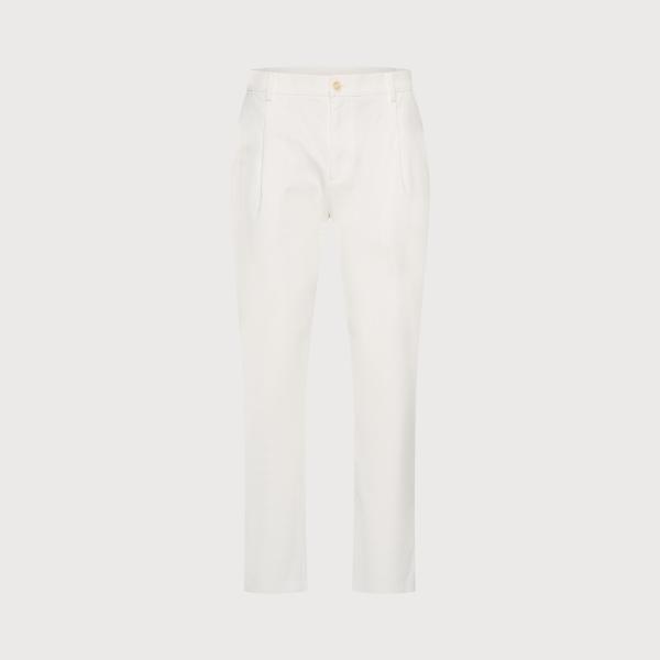 Deze chino is gemaakt van een katoenen stof met elastan en uitgevoerd met een knoopsluiting. Het model heeft een relaxed fit en een wide leg uitvoering. Aan de voorzijde is een bandplooi verwerkt. Op de broek is een subtiele logo badge aangebracht.
