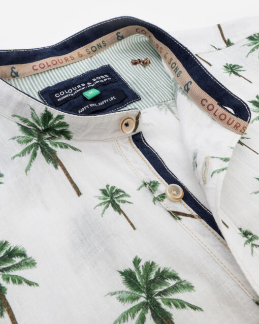 Dit shirt overtuigt met zijn moderne opstaande kraag en een palmboomprint. Het heeft een contrasterende stof in de kraag en manchet. Het shirt heeft een afgeronde zoomlijn en een iets langwerpige rug. De mix van katoen en hennep draagt bij aan een lichtgewicht gevoel. Geborduurd & logo op het achterste juk. Casual look met jeans of chino’ s. Goed om te weten: