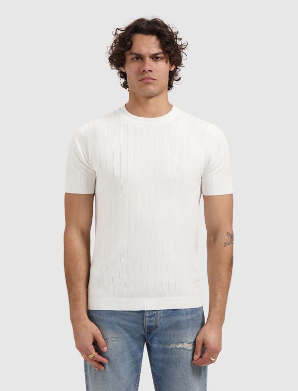 De Drop Needle Knit T-shirt heeft een regular fit met een klassieke crewneck en is gebreid van 80% viscose en 20% nylon voor een soepele en verzorgde uitstraling. De drop needle techniek voegt subtiele structuur toe en wordt afgewerkt met ribboorden aan body en mouwen. Een tonale signature triangle in de nek maakt deze cleane knit compleet.
