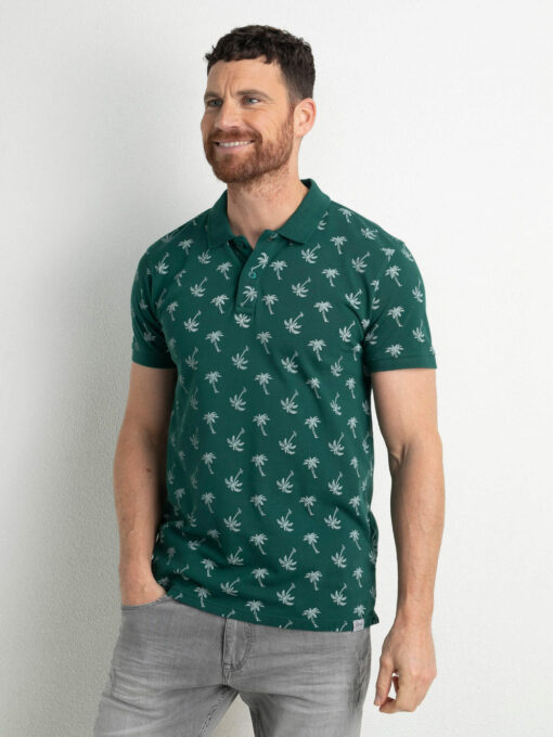 Zomerse polo met openstaande kraag en knoopsluiting. Deze polo heeft een all-over print met palmbomen en een effen ribgebreide kraag en boorden. Twijfel je tussen twee maten? Kies dan de grootste maat.