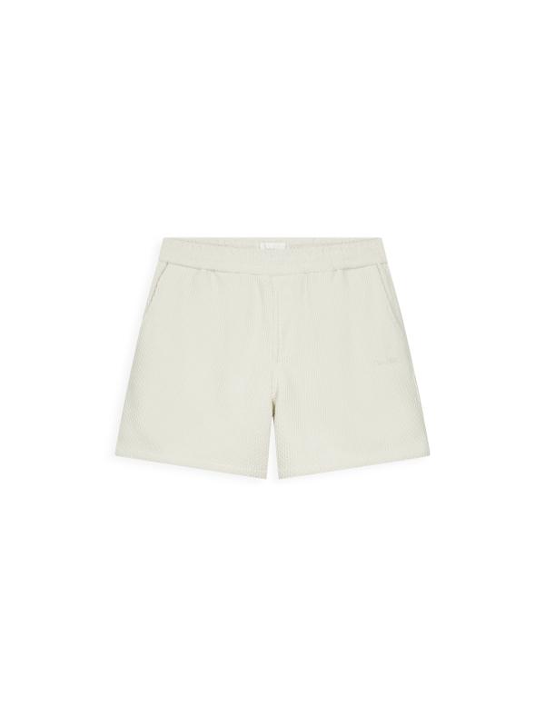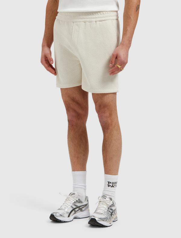 De Honeycomb Shorts heeft een regular fit met een regular leg en is gemaakt van 100% polyester in een honeycomb chenille structuur. De honingraatachtige knit creëert een subtiel geometrisch oppervlak met diepte en textuur, terwijl het chenille garen zorgt voor een zachte, licht verhoogde feel die het licht vangt. Deze constructie maakt de stof ademend en visueel rijk met een comfortabele bewegingsvrijheid. Ontworpen met een elastische tailleband verstelbaar met drawstrings en afgewerkt met twee zijzakken met verborgen ritsen. Op het linkerbeen verschijnt een geschreven embroidery logo.