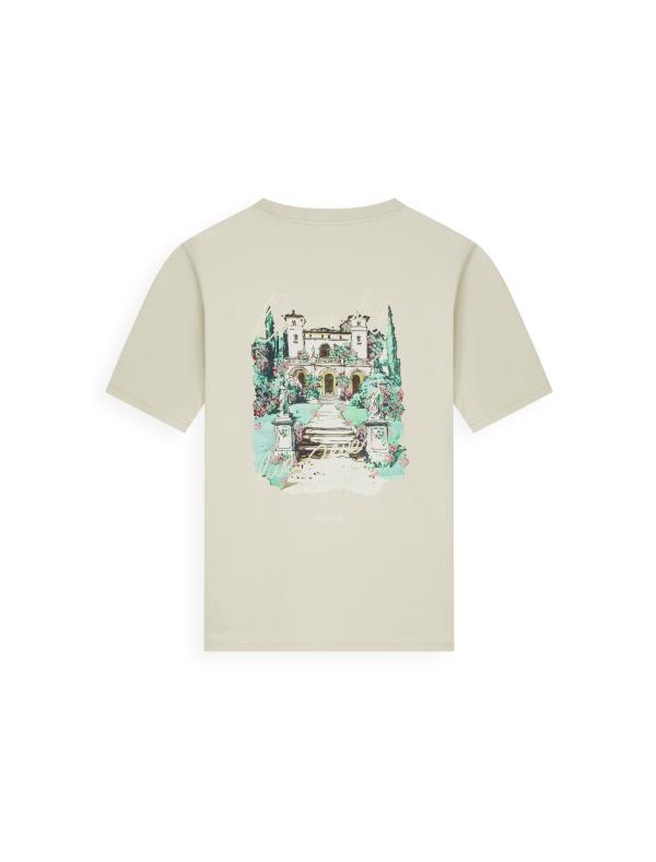 De Dream Mansion T-shirt heeft een regular fit met een klassieke crewneck en is gemaakt van 100% katoen interlock jersey voor een soepele en gestructureerde feel. Een klein logo staat links op de borst. Op de rug ontvouwt zich een Italiaans mansion artwork als symbool voor ambitie en visie, verrijkt met chainstitch embroidery die diepte en karakter toevoegt. In de nek zit onze subtiele tonale signature triangle branding.