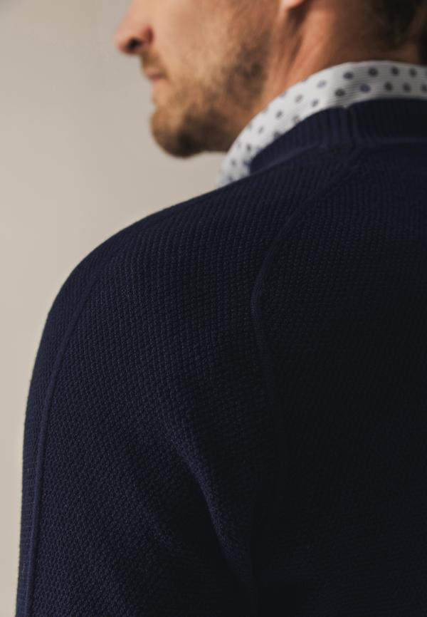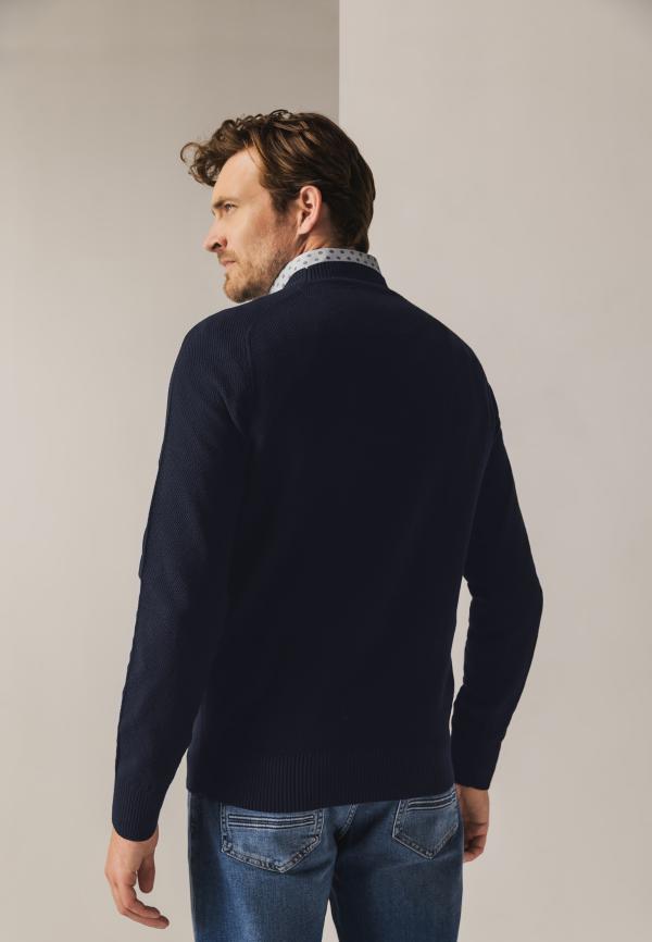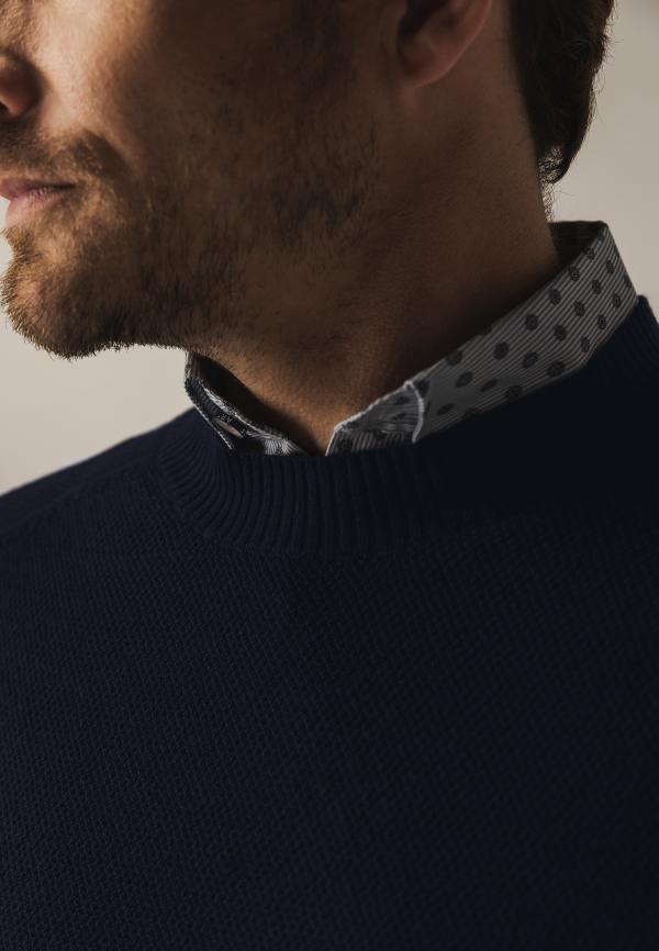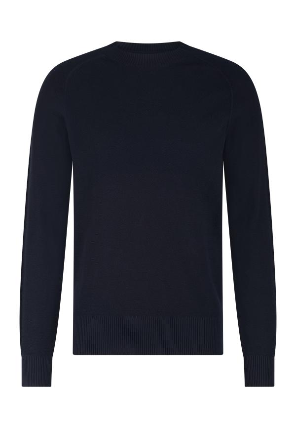 Deze regular fit trui met ronde hals is uitgevoerd in een structuurgebreid dessin van GOTS-gecertificeerd biologisch katoen. De zadelmouwen lopen vloeiend door in de schouderlijn, wat zorgt voor een gestroomlijnde look en een comfortabele pasvorm rond de hals, terwijl de ribboorden het geheel netjes afwerken.